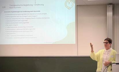 Im zweiten Teil des Nachmittags hielt Simone Arnheiter, Naturheilpraktikerin und zertifizierte Ayurveda-Medizinerin (OdA AM) aus Baden, einen Vortrag über Ayurveda und mögliche komplementäre Ansätze bei GBS / CIDP / MMN. Sie zeigte auf, wie sich schulmedizinische Therapien und komplementärmedizinische Ansätze – etwa Ayurveda oder auch die Traditionelle Chinesische Medizin – sinnvoll ergänzen können. Dabei ging sie auch auf Fragen ein, die zuvor in der neurologischen Fragerunde diskutiert worden waren. Anschaulich erklärte sie unter anderem die Wirkung von Ölanwendungen, den Einfluss von Ernährung und Gewürzen sowie einfache Möglichkeiten, ayurvedische Prinzipien in den Alltag zu integrieren. Beispiele waren etwa Ölziehen, Selbstmassagen mit Öl, warme Mahlzeiten, Ingwertee am Morgen oder der regelmäßige Einsatz von Gewürzen wie Kurkuma in der Küche. Der Vortrag führte zu einem lebhaften Austausch und gab den Teilnehmenden vielleicht sogar neue Impulse für den eigenen Alltag.
